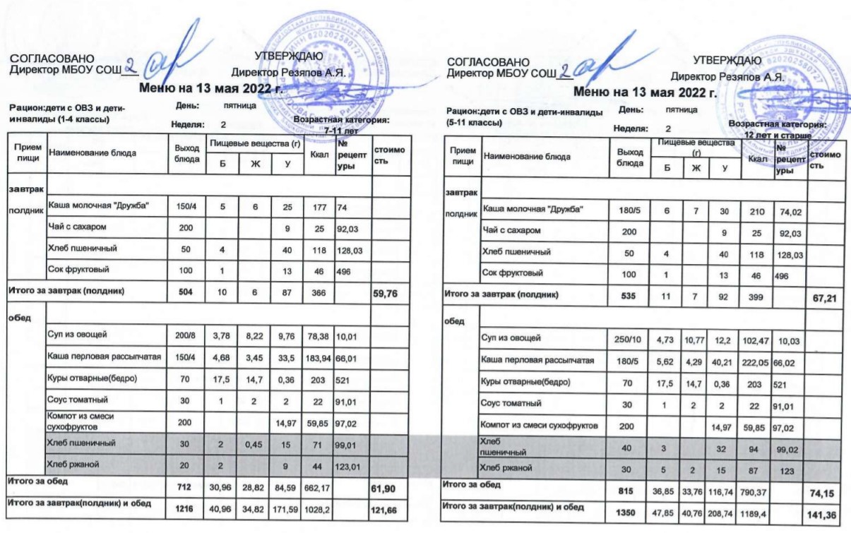 (Меню для детей с ОВЗ и детей-инвалидов, 1-11 классы на 13 мая 2022 года)