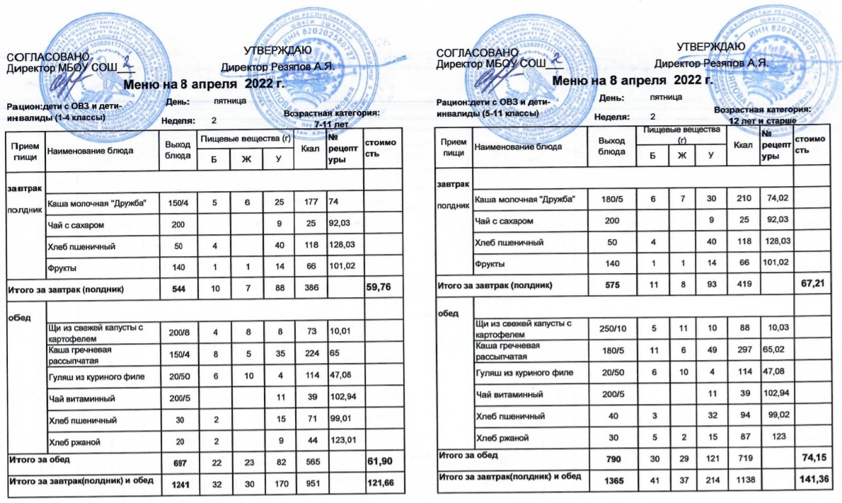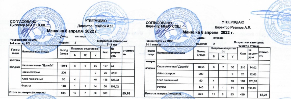 (Меню для детей из ММС, 1-11 классы, РП на 8 апреля 2022 года)