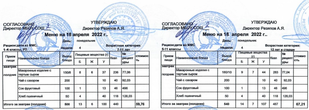 (Меню для детей из ММС, 1-11 классы, РП на 18 апреля 2022 года)