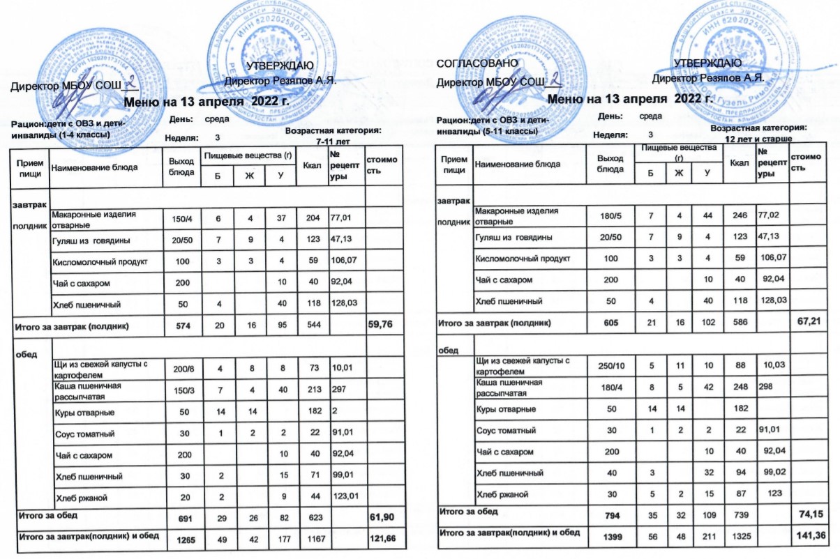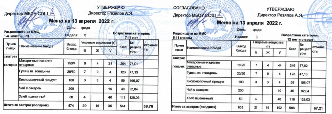 (Меню для детей из ММС, 1-11 классы, РП на 13 апреля 2022 года)