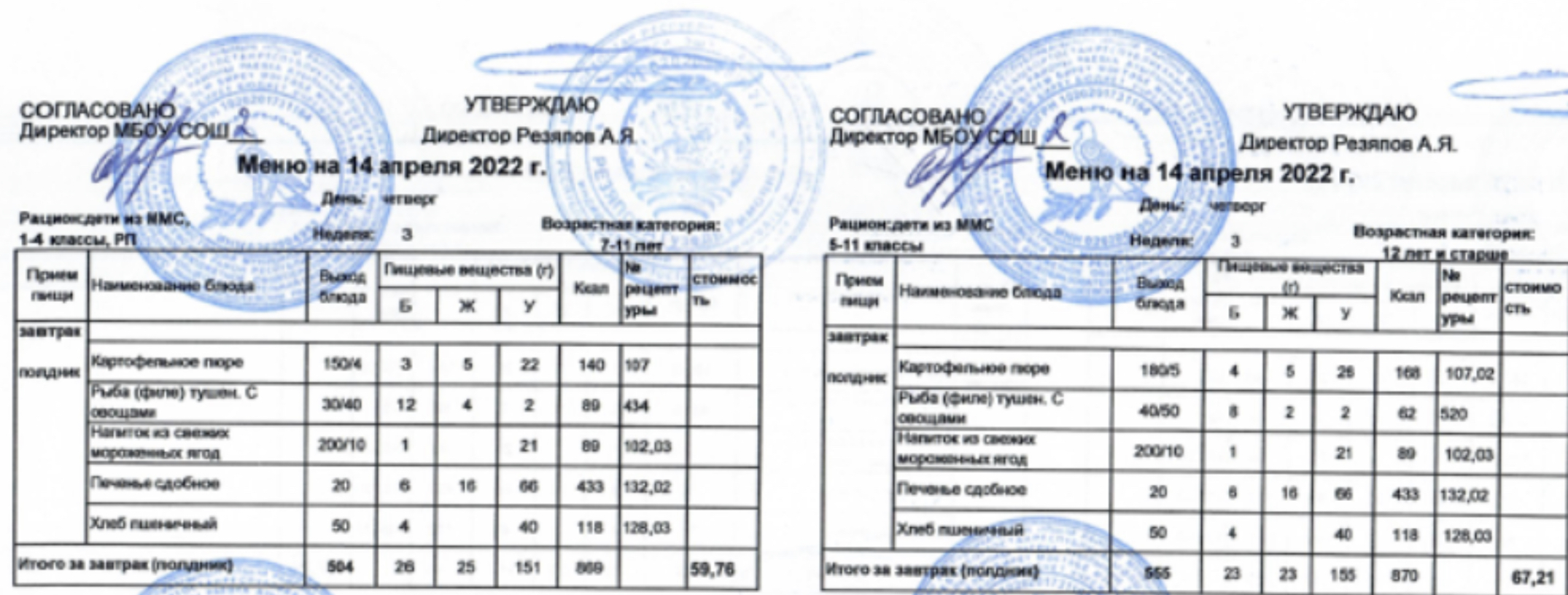 (Меню для детей из ММС, 1-11 классы, РП на 14 апреля 2022 года)