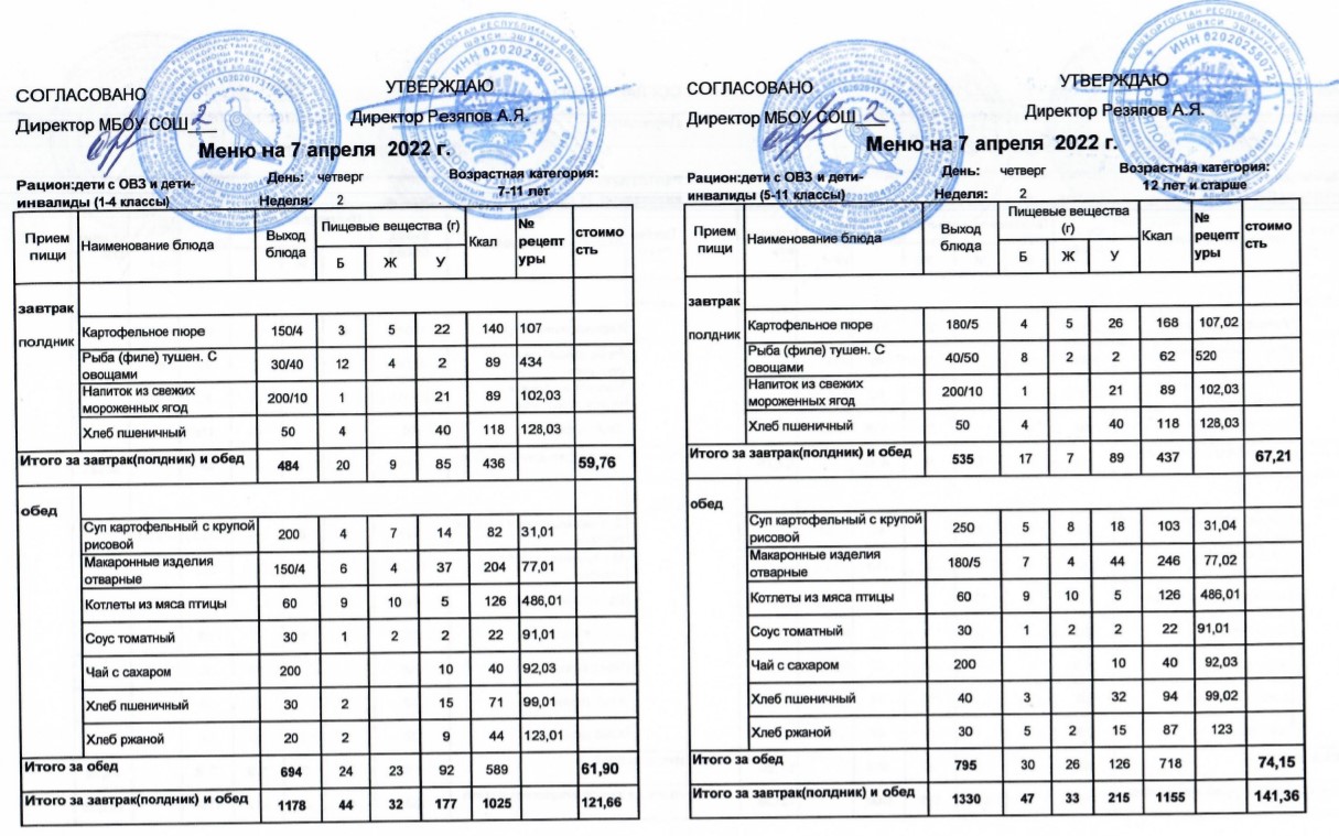 (Меню для детей с ОВЗ и детей-инвалидов, 1-11 классы на 7 апреля 2022 года)