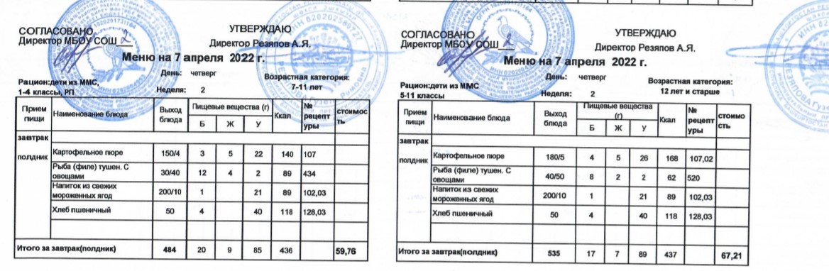 (Меню для детей из ММС, 1-11 классы, РП на 7 апреля 2022 года)