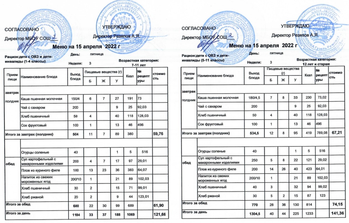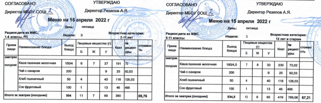 (Меню для детей из ММС, 1-11 классы, РП на 15 апреля 2022 года)