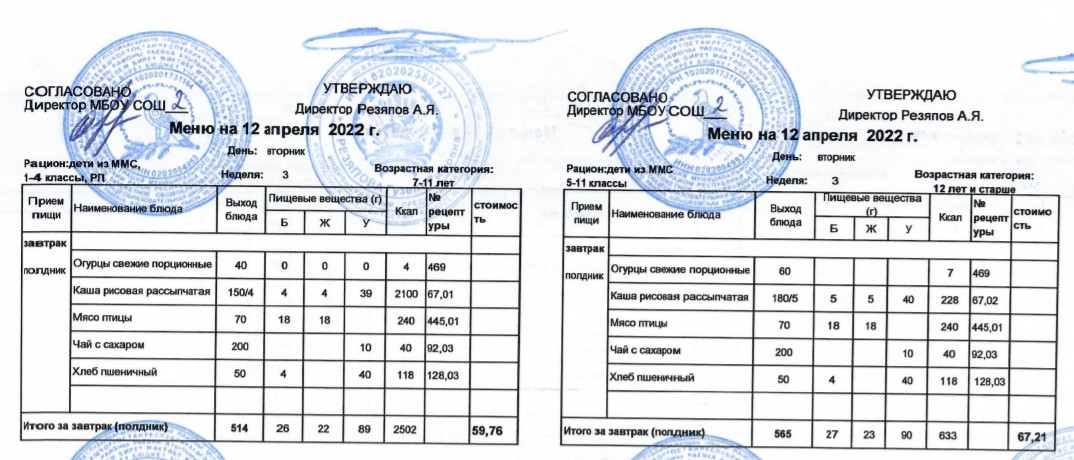 (Меню для детей из ММС, 1-11 классы, РП на 12 апреля 2022 года)