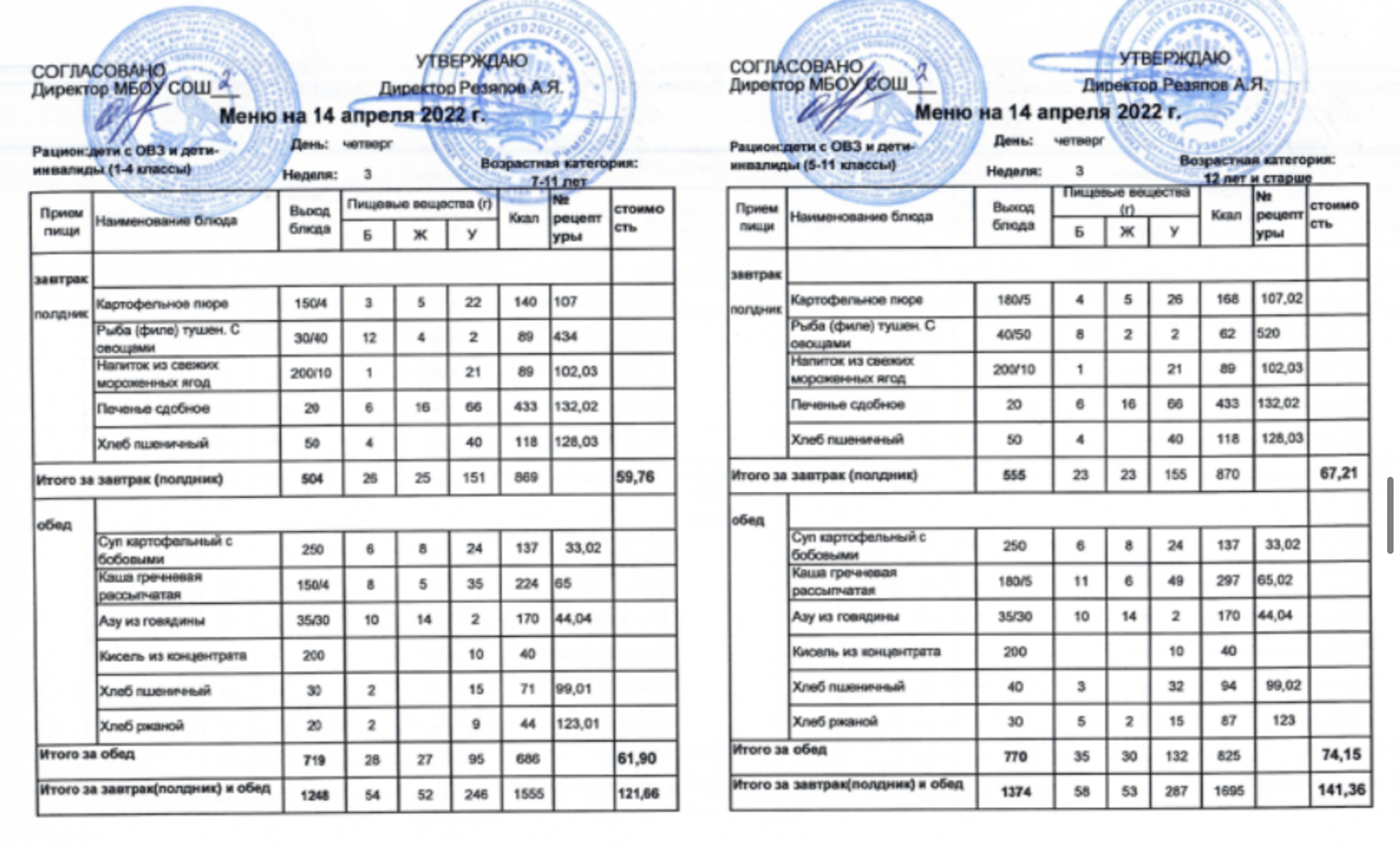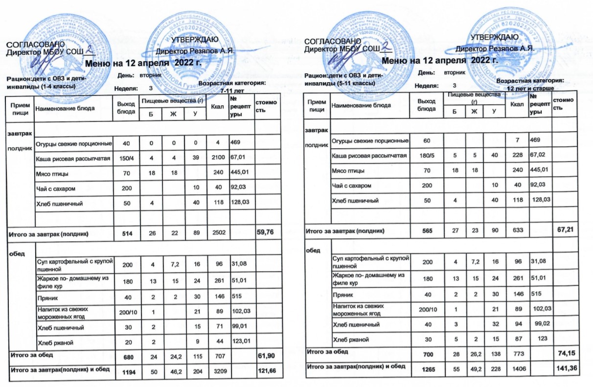 (Меню для детей с ОВЗ и детей-инвалидов, 1-11 классы на 12 апреля 2022 года)