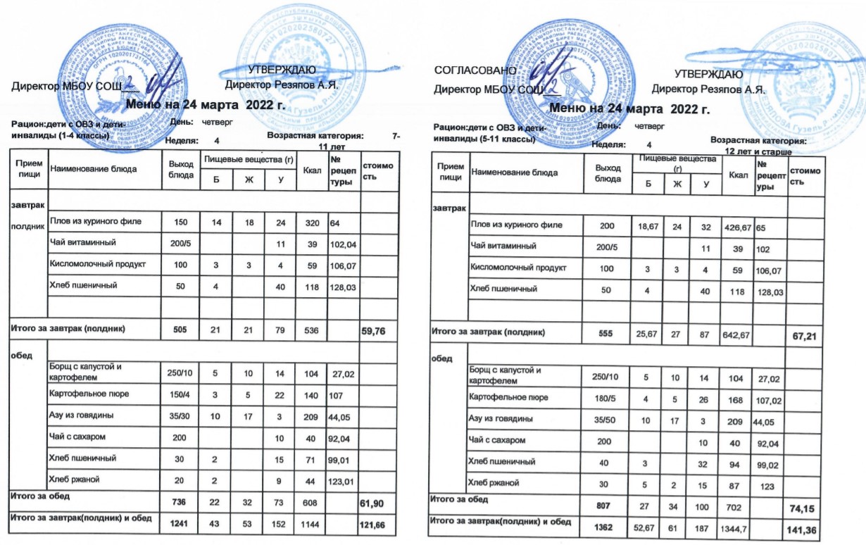 (Меню для детей с ОВЗ и детей-инвалидов, 1-11 классы на 24 марта 2022 года)