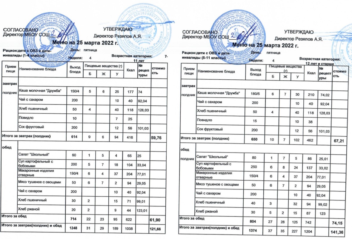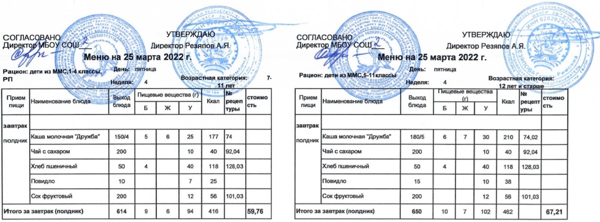 (Меню для детей из ММС, 1-11 классы, РП на 25 марта 2022 года)