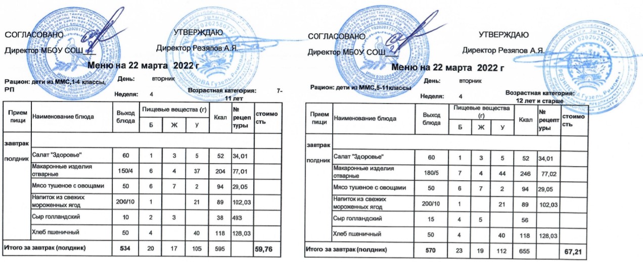 (Меню для детей из ММС, 1-11 классы, РП на 22 марта 2022 года)