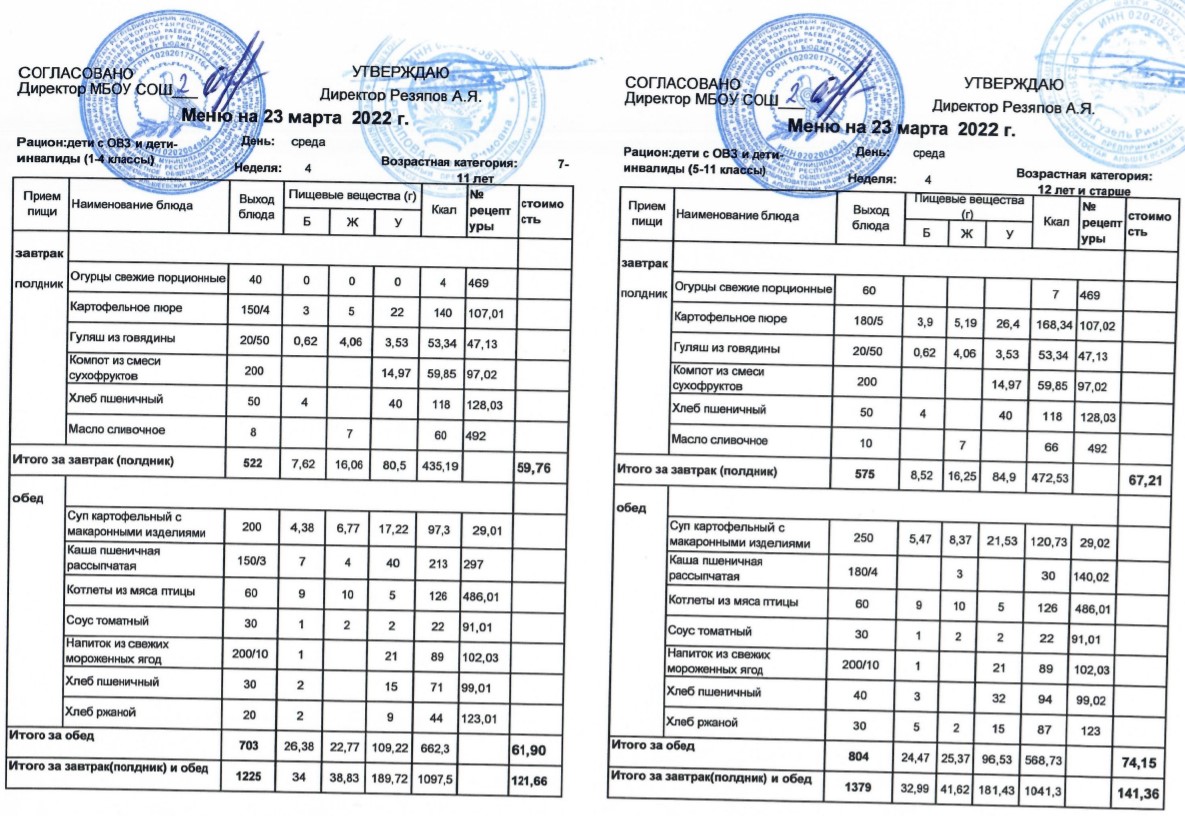 (Меню для детей с ОВЗ и детей-инвалидов, 1-11 классы на 23 марта 2022 года)
