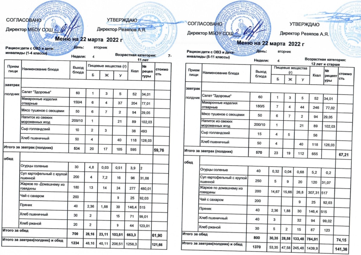 (Меню для детей с ОВЗ и детей-инвалидов, 1-11 классы на 22 марта 2022 года)
