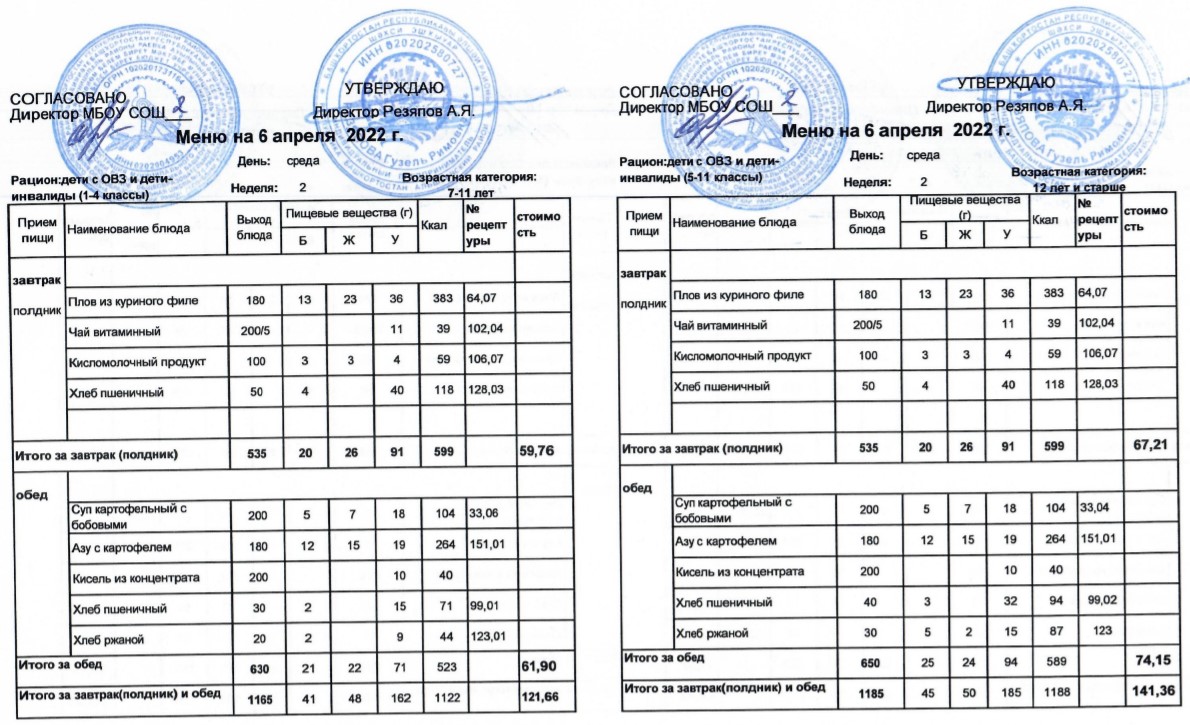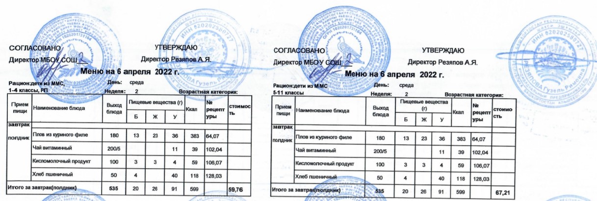 (Меню для детей из ММС, 1-11 классы, РП на 6 апреля 2022 года)