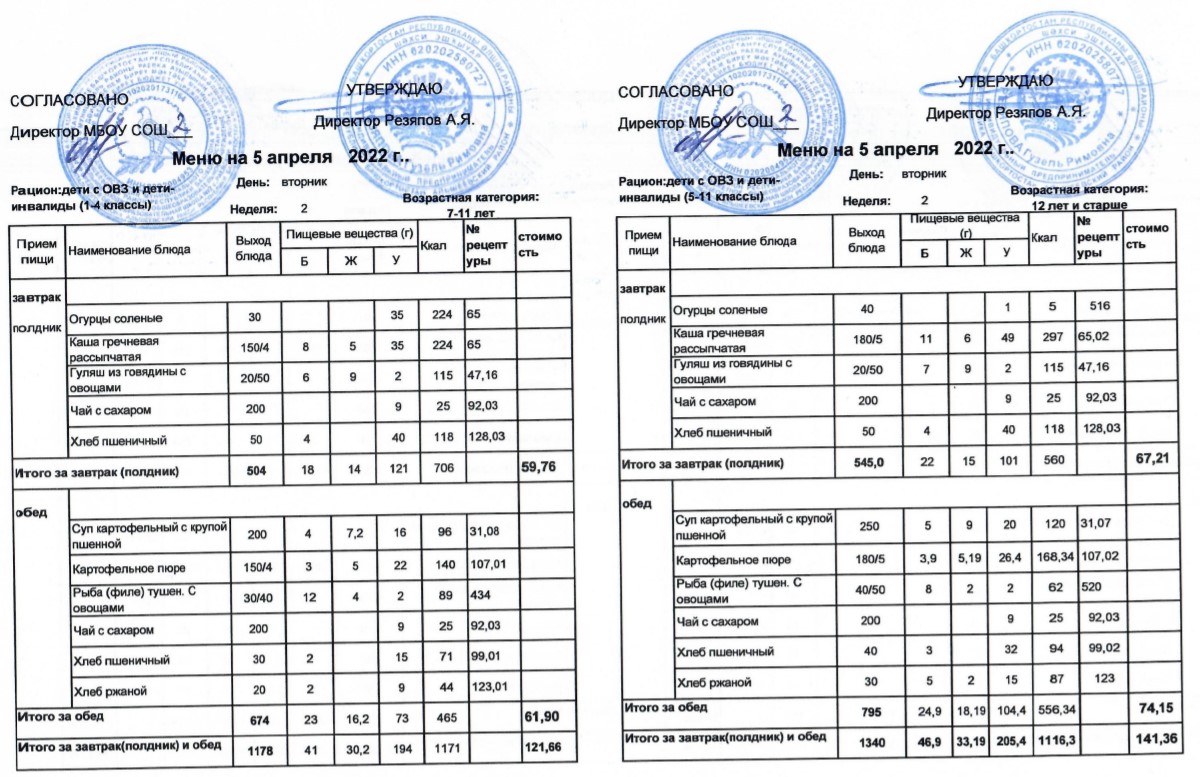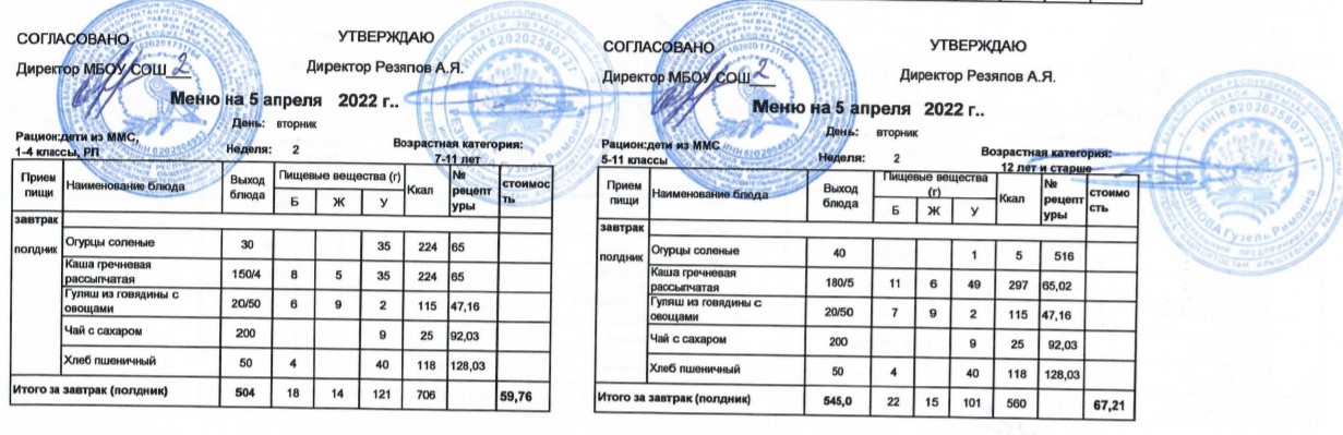 (Меню для детей из ММС, 1-11 классы, РП на 5 апреля 2022 года)