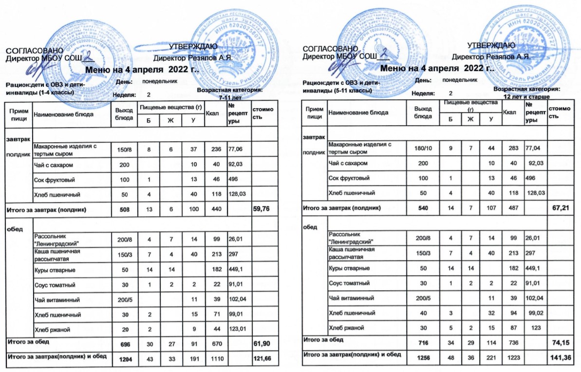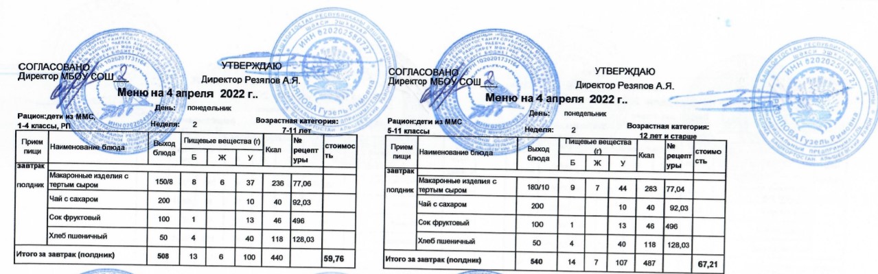 (Меню для детей из ММС, 1-11 классы, РП на 4 апреля 2022 года)