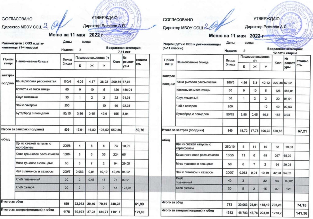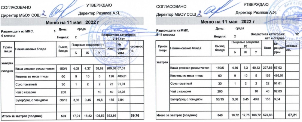 (Меню для детей из ММС, 1-11 классы, РП на 11 мая 2022 года)
