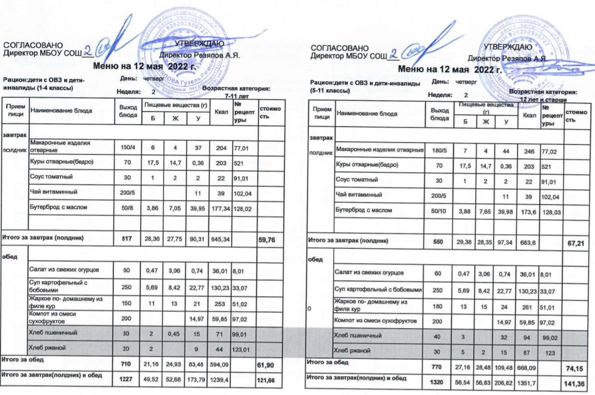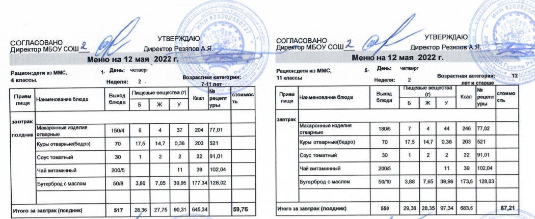 (Меню для детей из ММС, 1-11 классы, РП на 12 мая 2022 года)