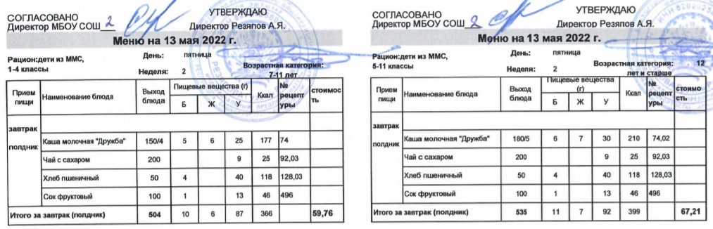 (Меню для детей из ММС, 1-11 классы, РП на 13 мая 2022 года)