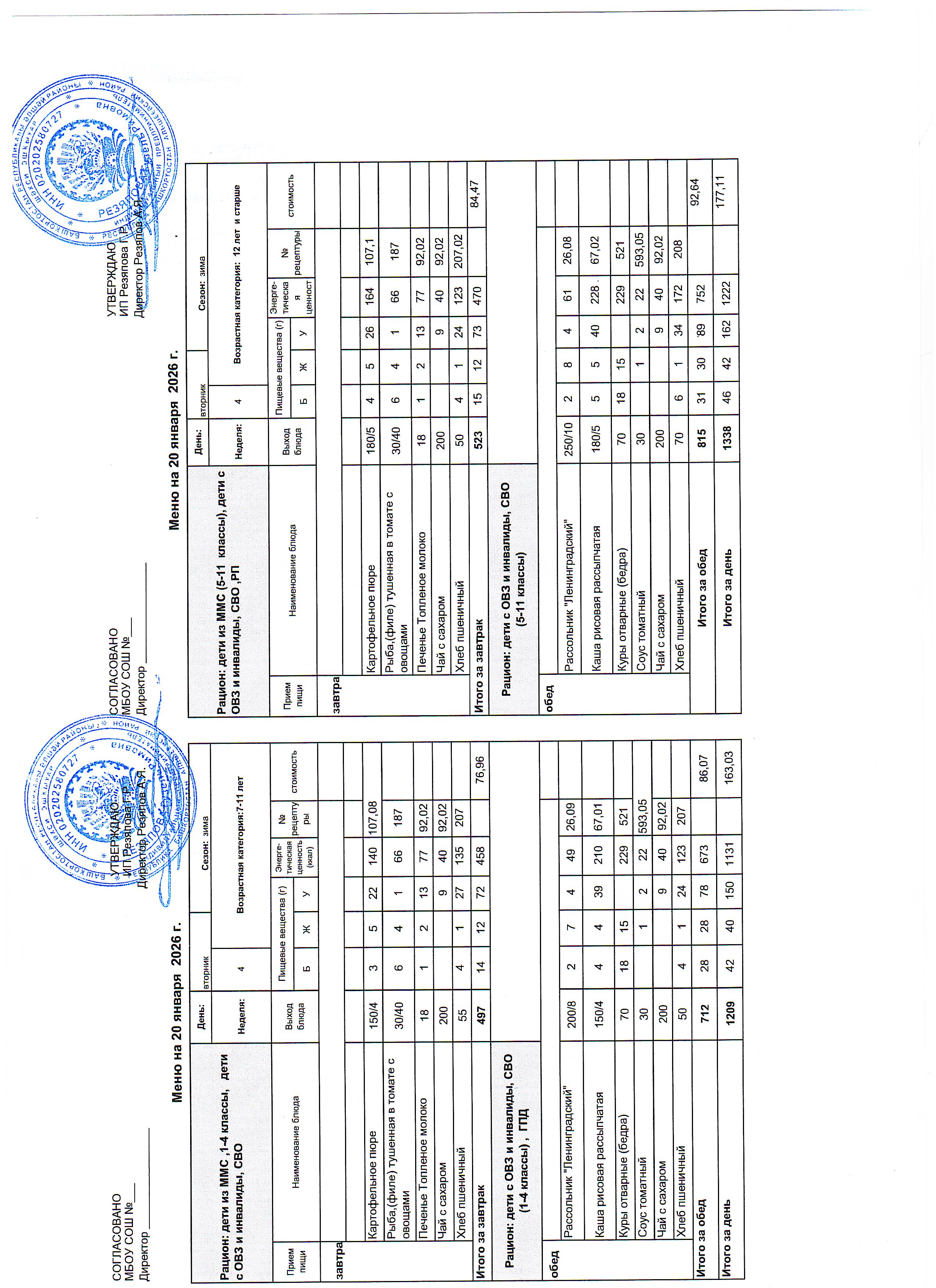 (Меню для детей из ММС, 1-11 классы, РП на 17 января 2023 года)
