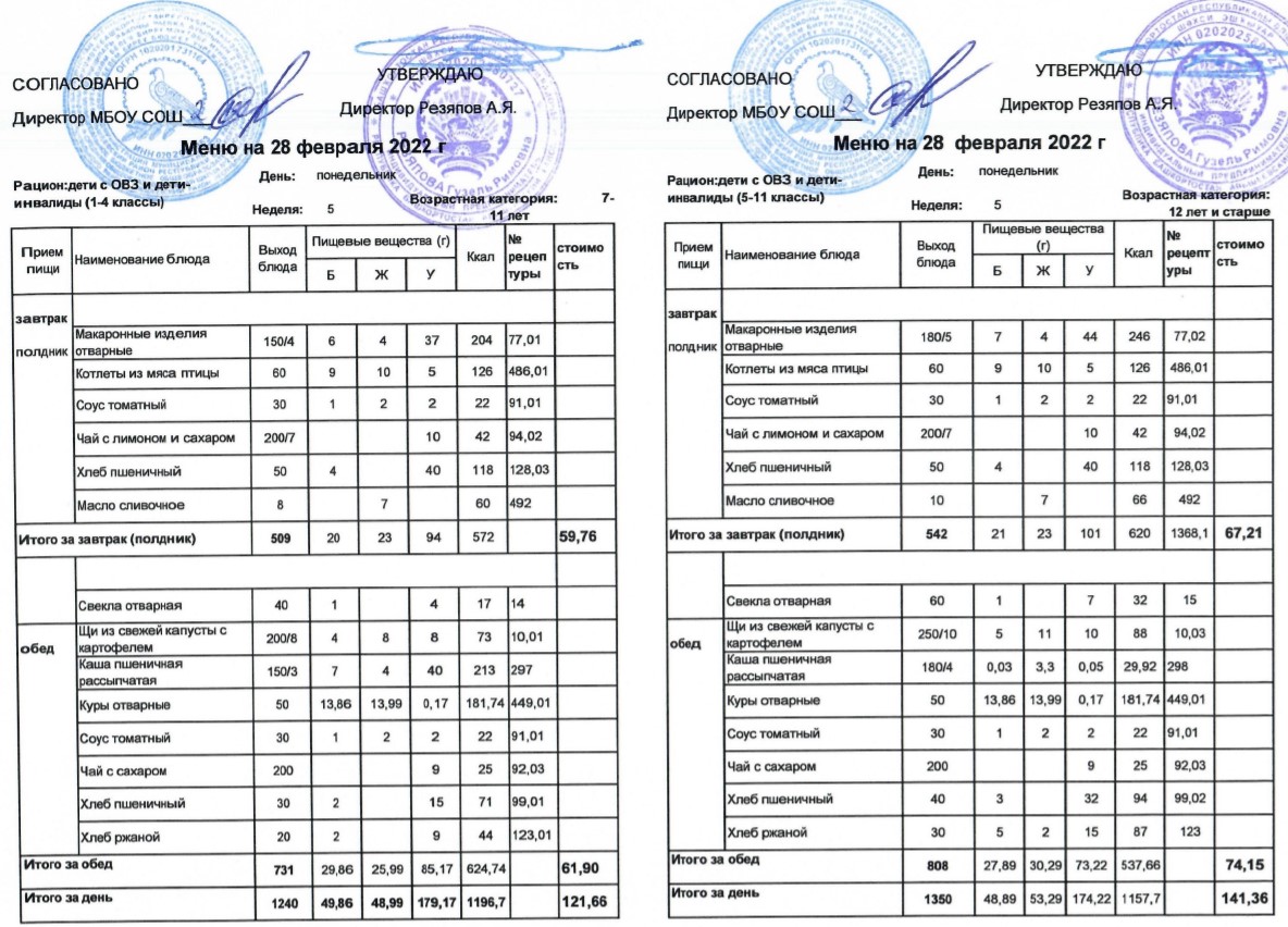 (Меню для детей с ОВЗ и детей-инвалидов, 1-11 классы на 28 февраля 2022 года)