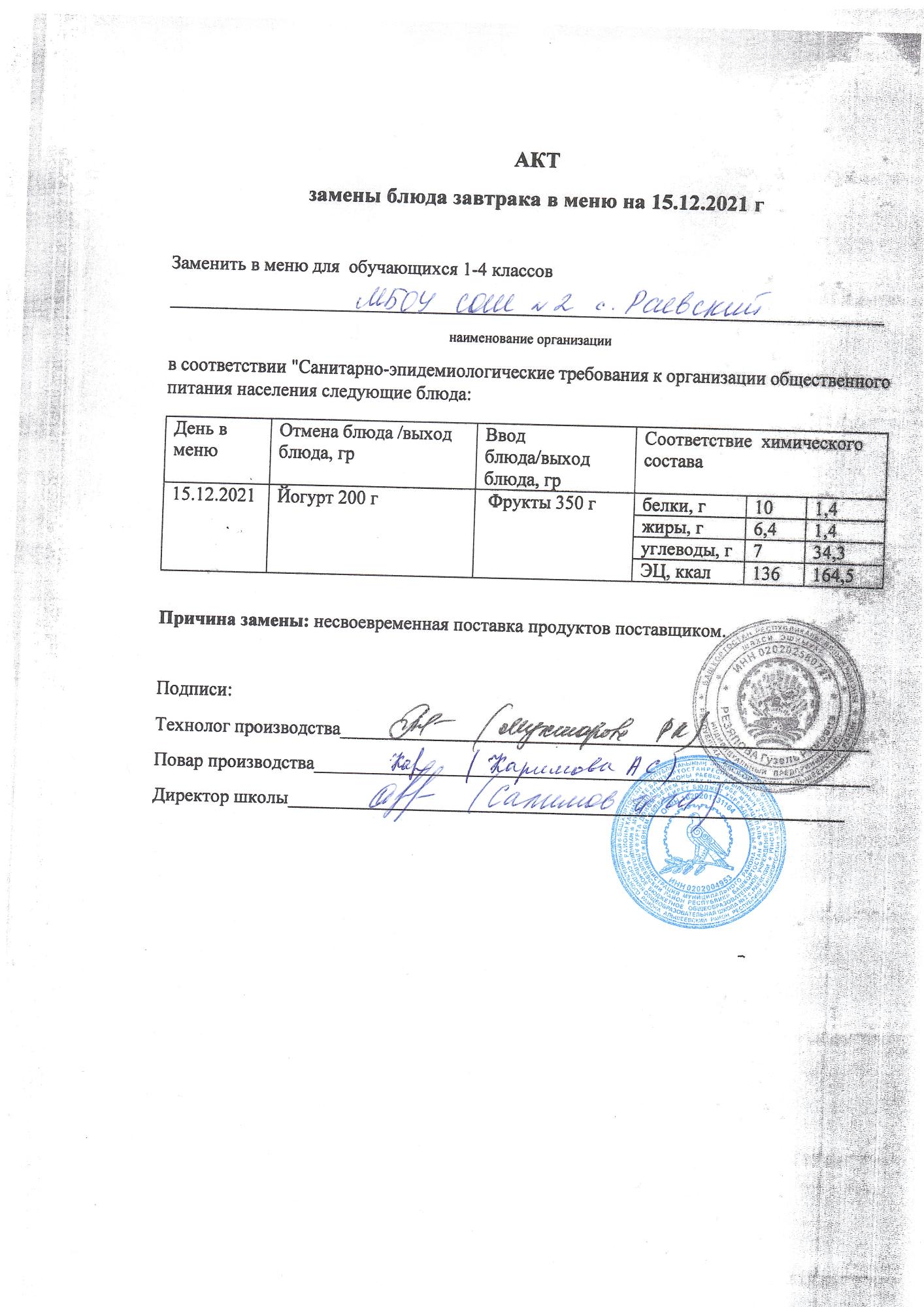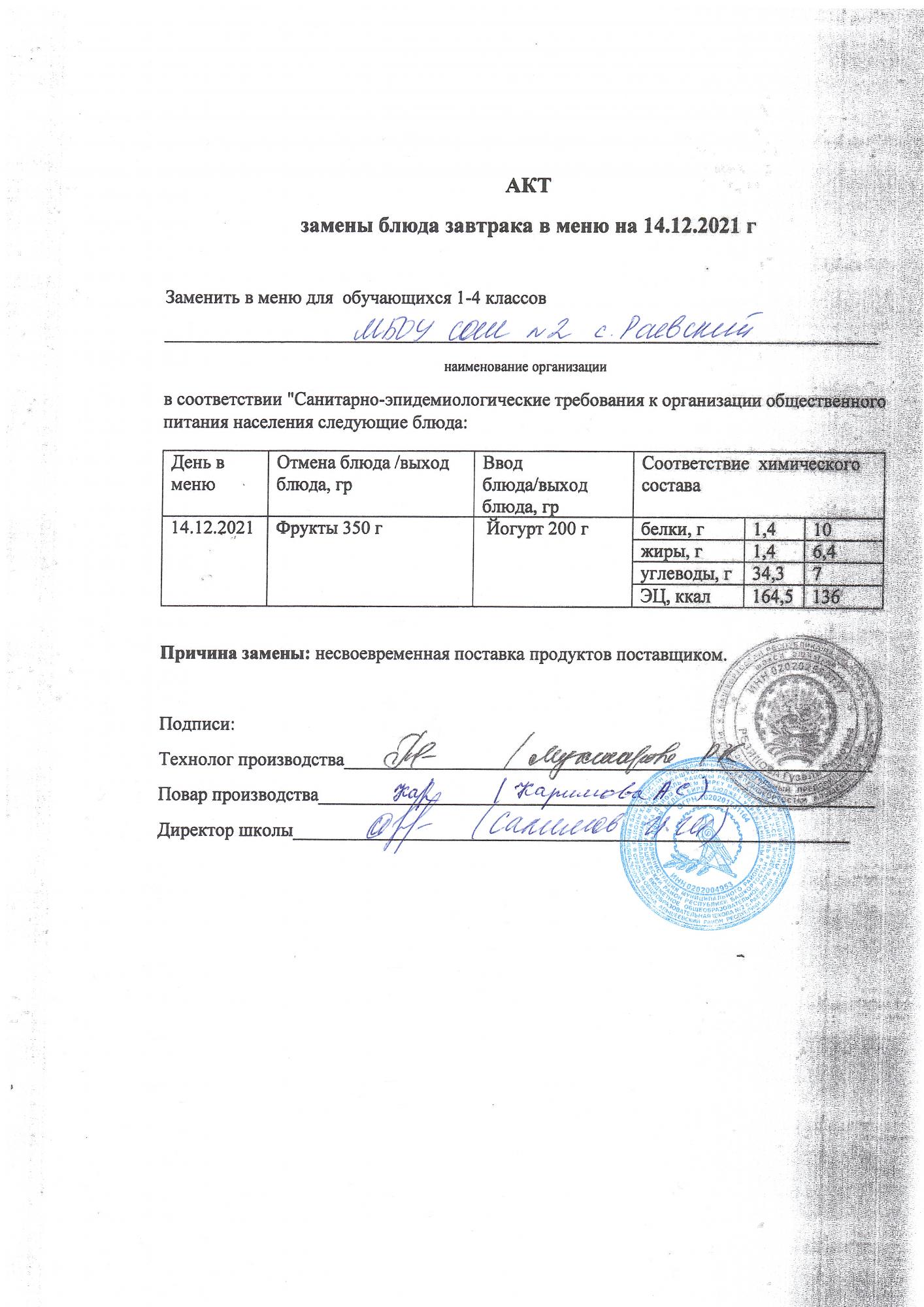 (Акт замены блюда завтрака в меню на 14.12.2021)
