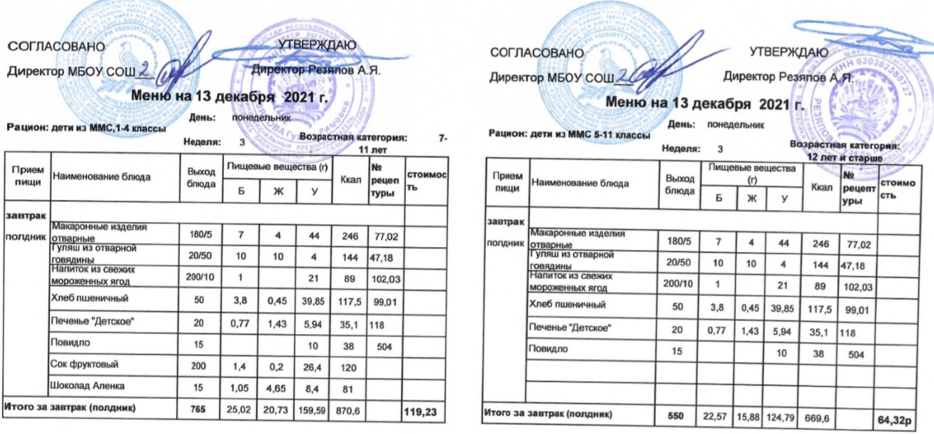 (Меню для детей из ММС, 1-11 классы, РП на 13 декабря 2021 года)