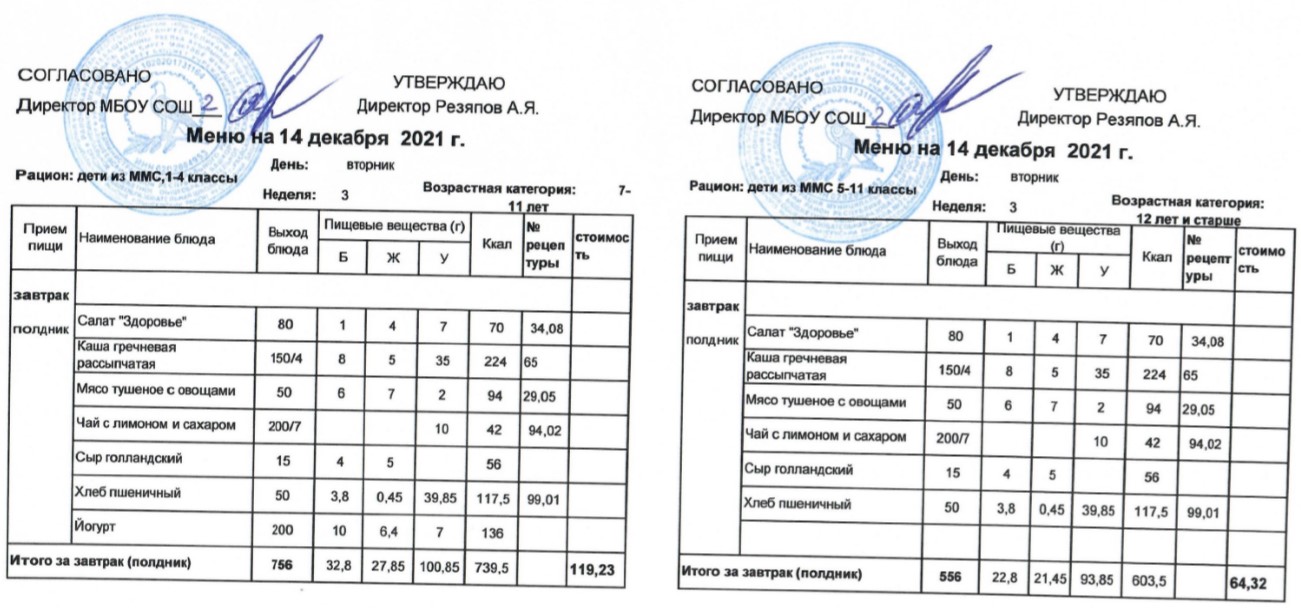 (Меню для детей из ММС, 1-11 классы, РП на 14 декабря 2021 года)