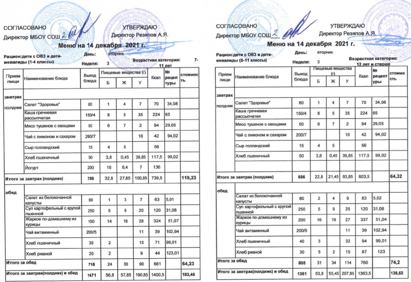 (Меню для детей с ОВЗ и детей-инвалидов, 1-11 классы на 14 декабря 2021 года)