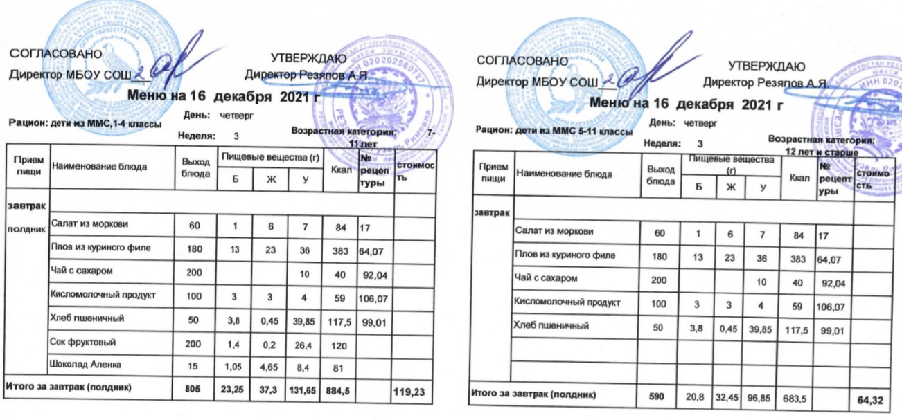 (Меню для детей из ММС, 1-11 классы, РП на 16 декабря 2021 года)