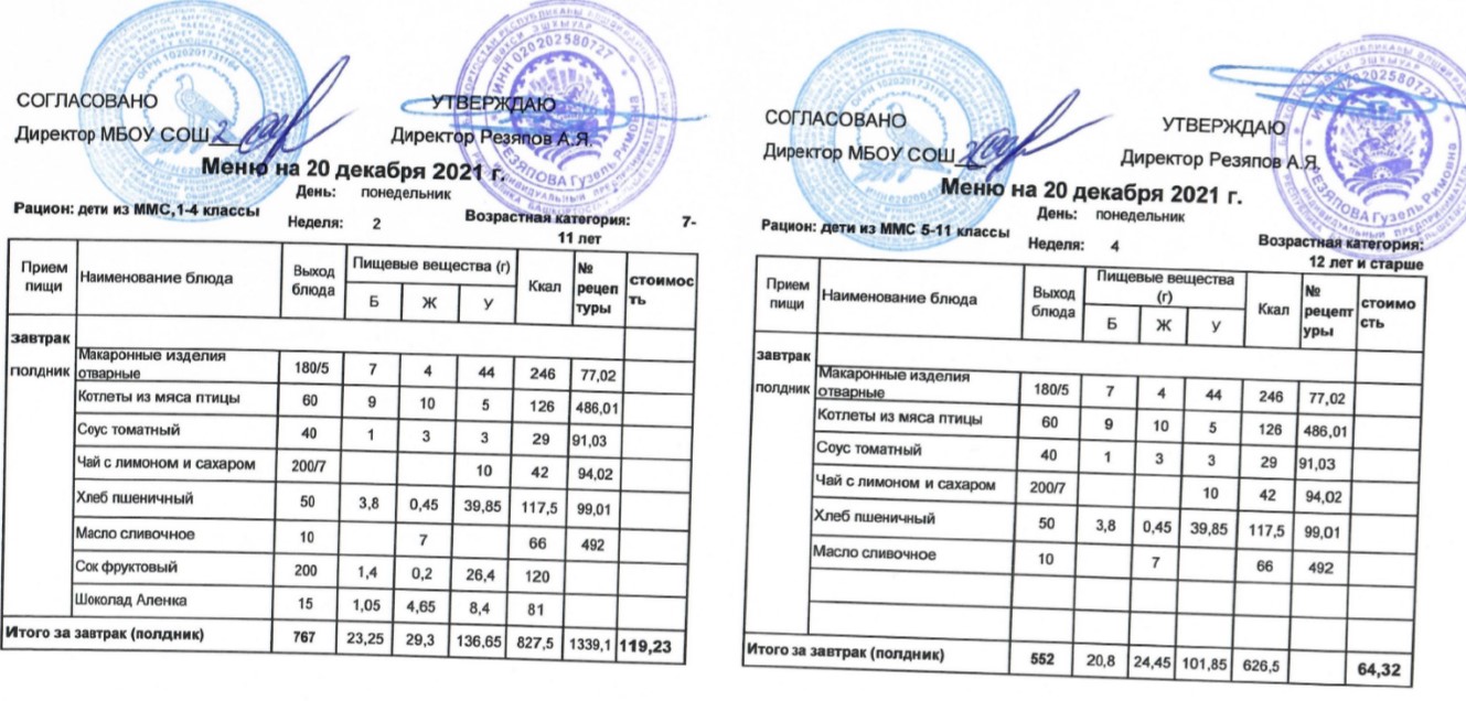 (Меню для детей из ММС, 1-11 классы, РП на 20 декабря 2021 года)