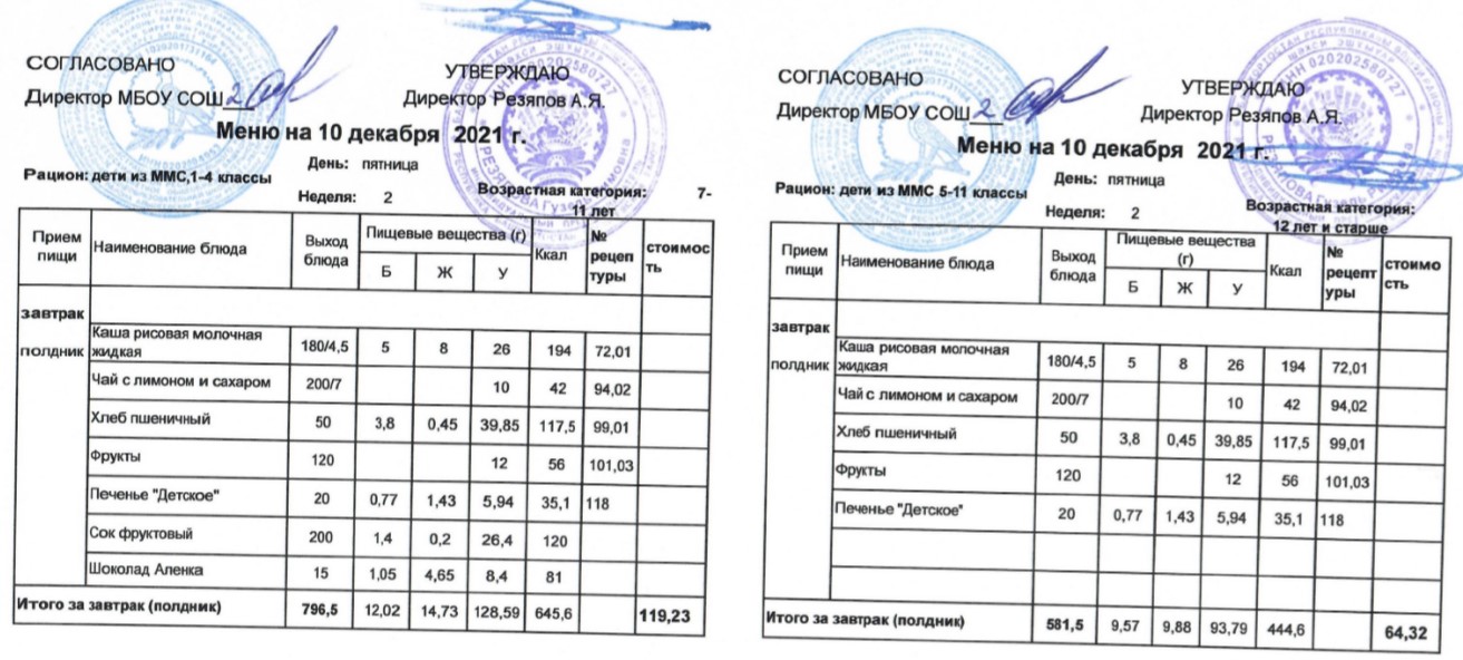 (Меню для детей из ММС, 1-11 классы, РП на 10 декабря 2021 года)