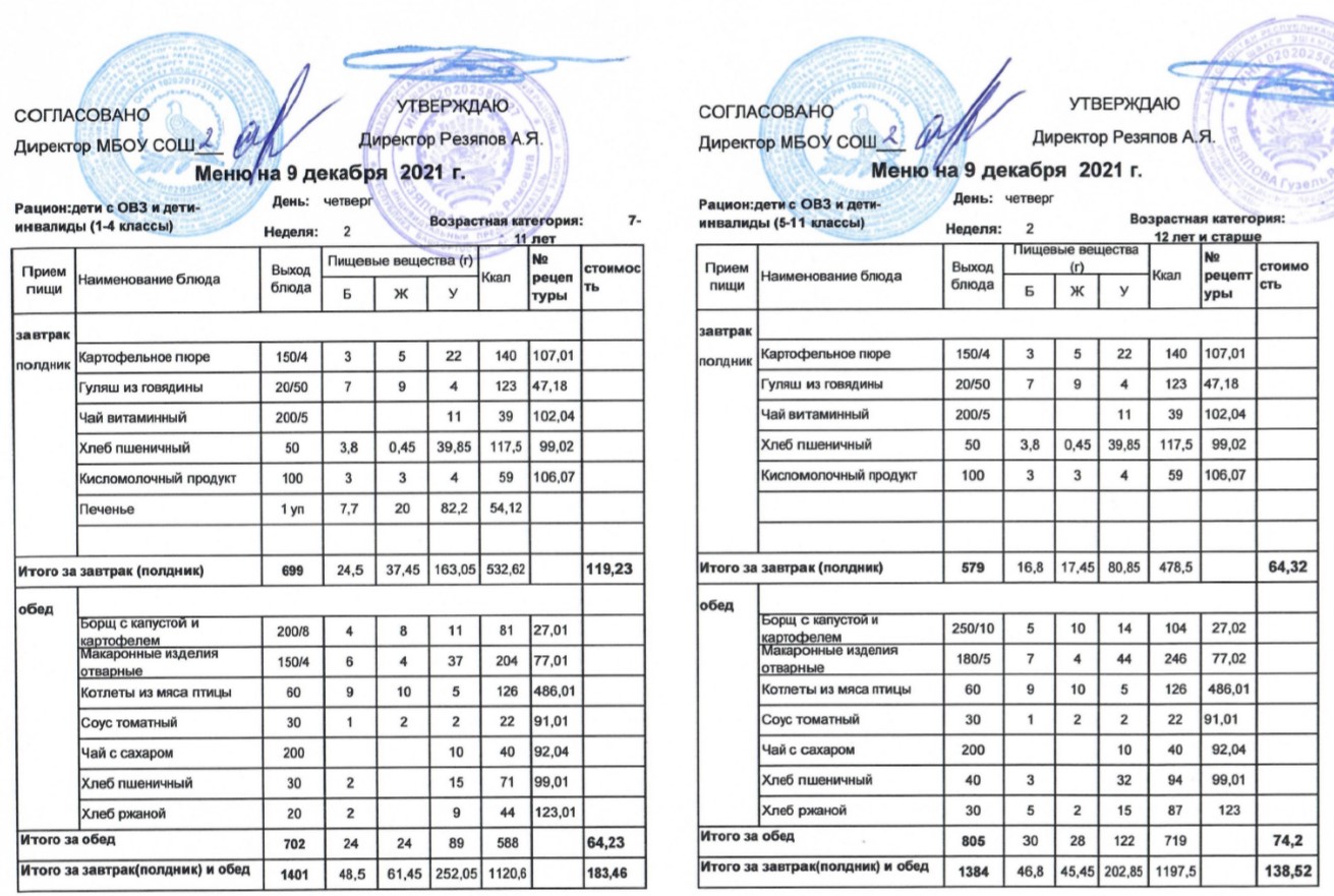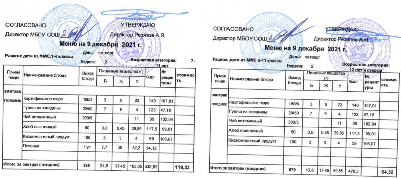 (Меню для детей из ММС, 1-11 классы, РП на 9 декабря 2021 года)