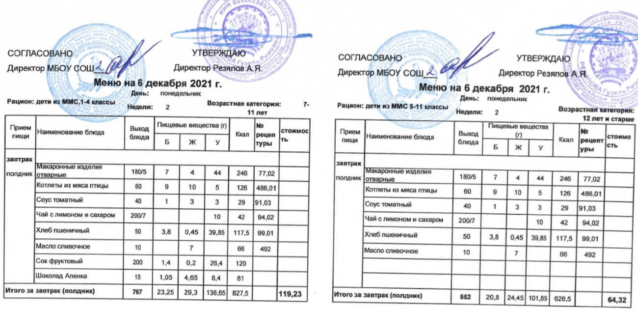 (Меню для детей из ММС, 1-11 классы, РП на 6 декабря 2021 года)