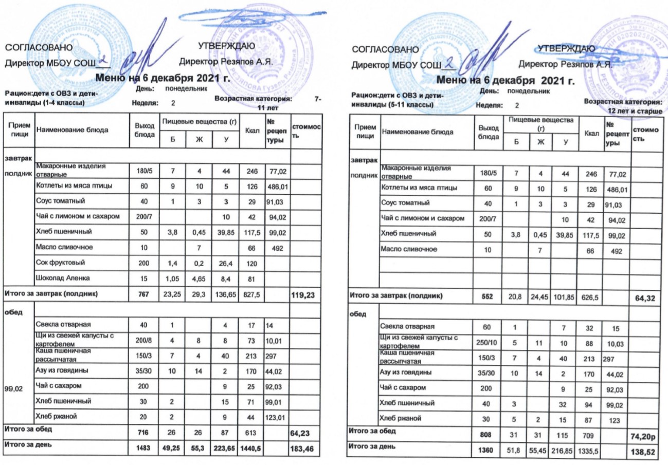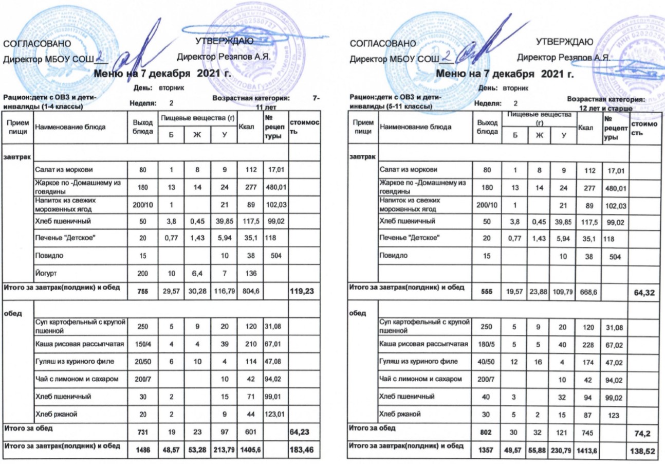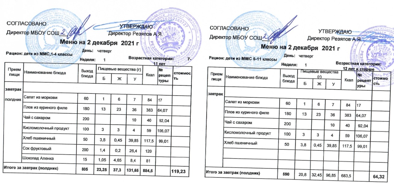 (Меню для детей из ММС, 1-11 классы, РП на 2 декабря 2021 года)