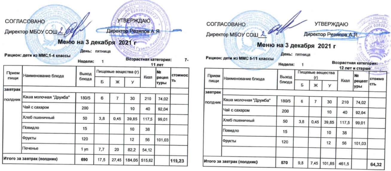 (Меню для детей из ММС, 1-11 классы, РП на 3 декабря 2021 года)