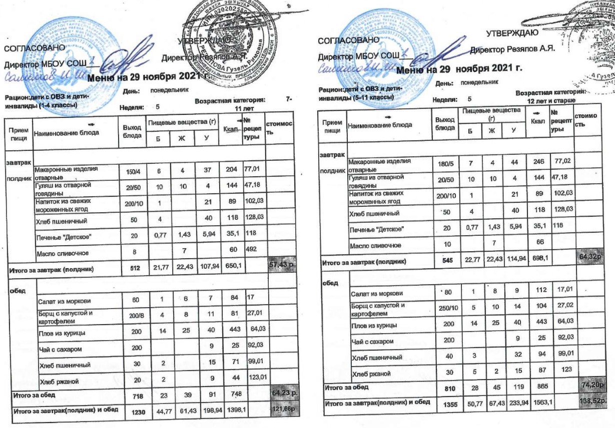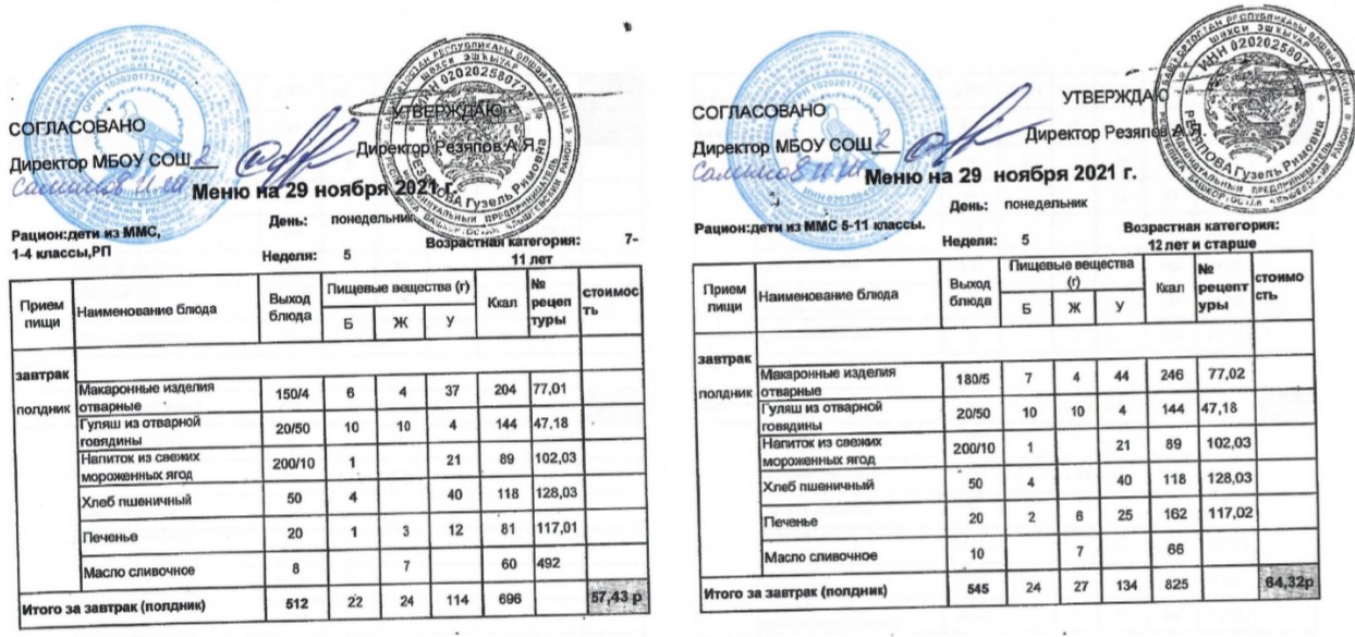 (Меню для детей из ММС, 1-11 классы, РП на 29 ноября 2021 года)