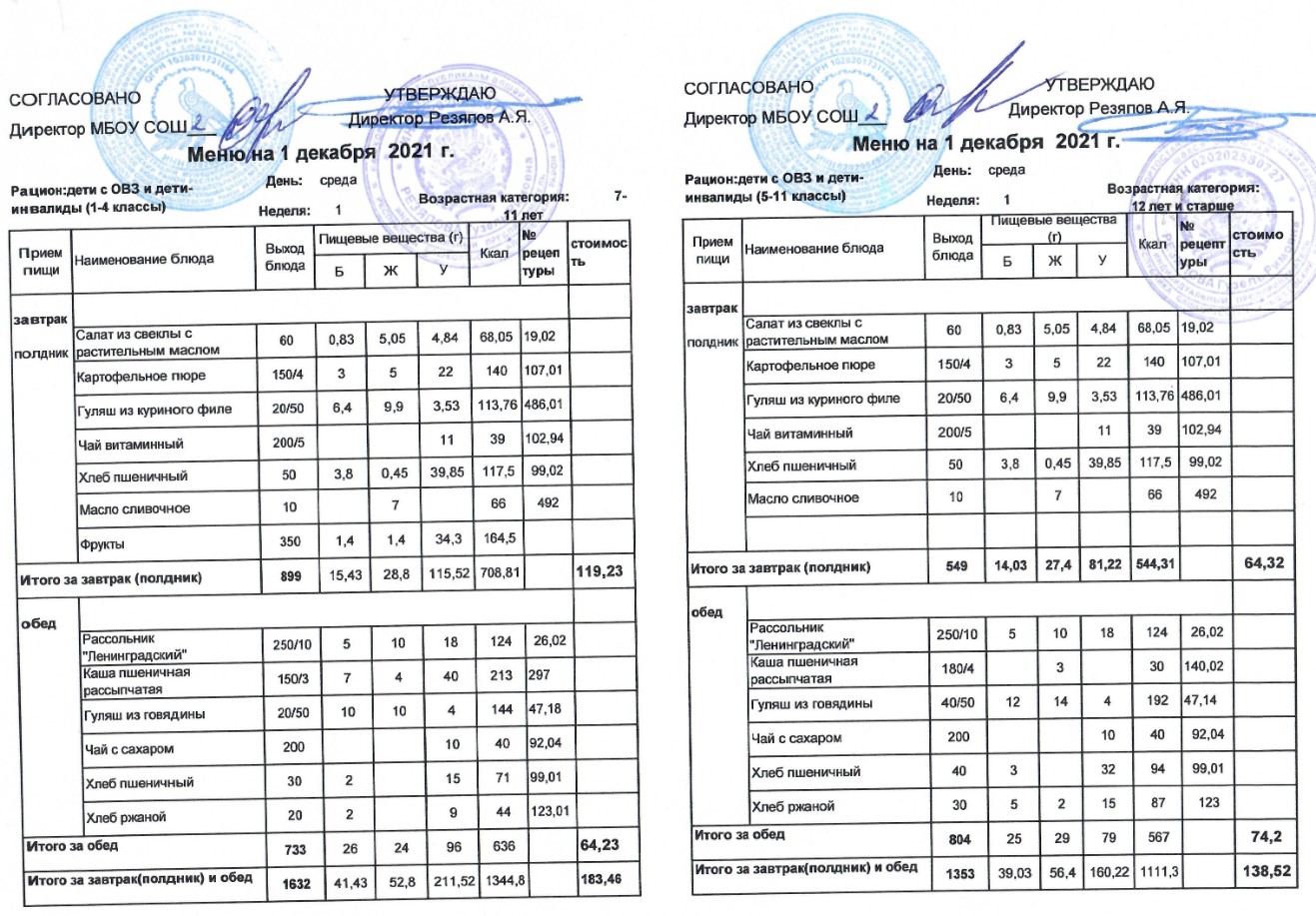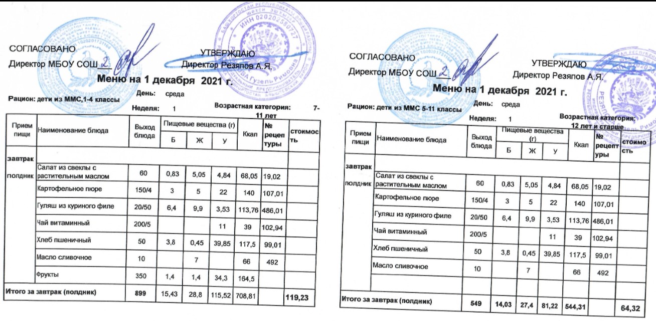 (Меню для детей из ММС, 1-11 классы, РП на 1 декабря 2021 года)