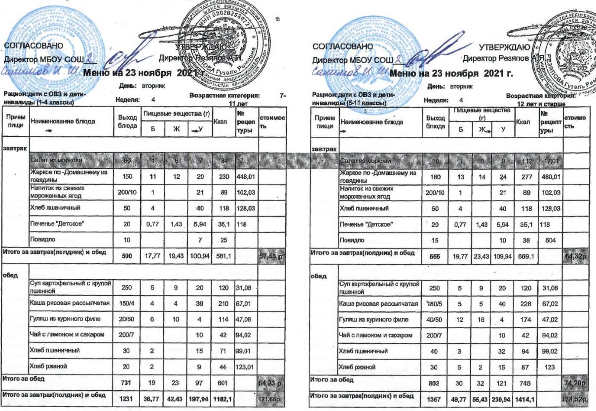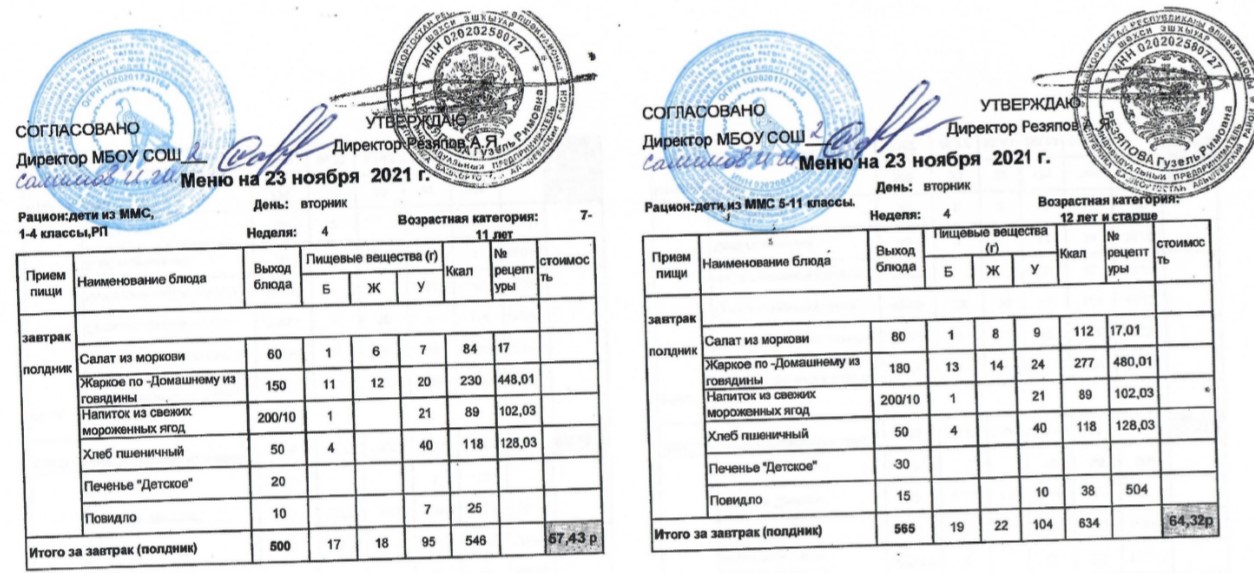 (Меню для детей из ММС, 1-11 классы, РП на 23 ноября 2021 года)