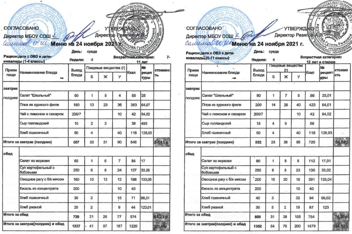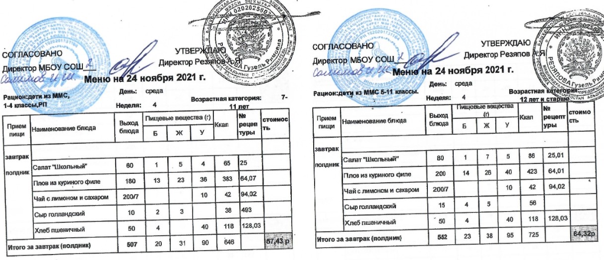 (Меню для детей из ММС, 1-11 классы, РП на 24 ноября 2021 года)
