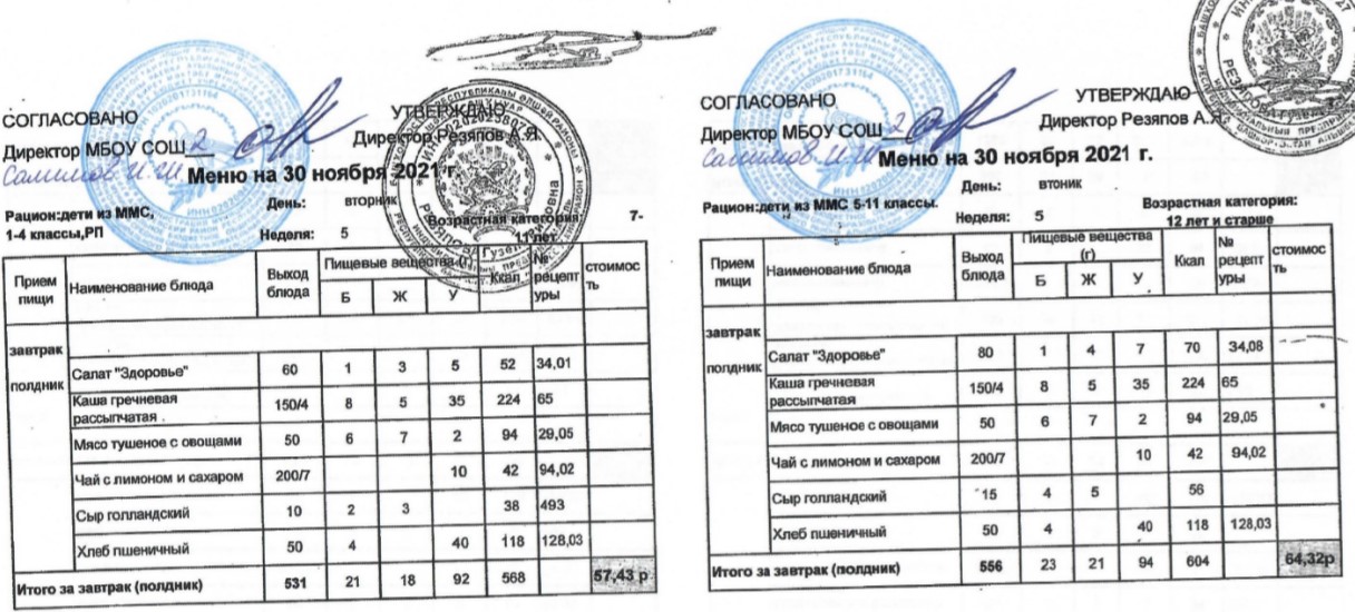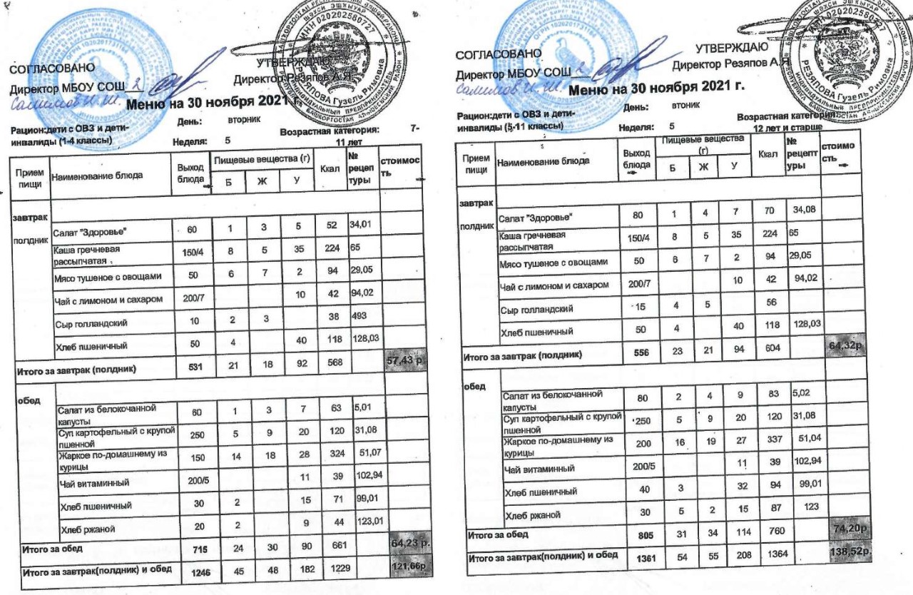 (Меню для детей из ММС, 1-11 классы, РП на 30 ноября 2021 года)
