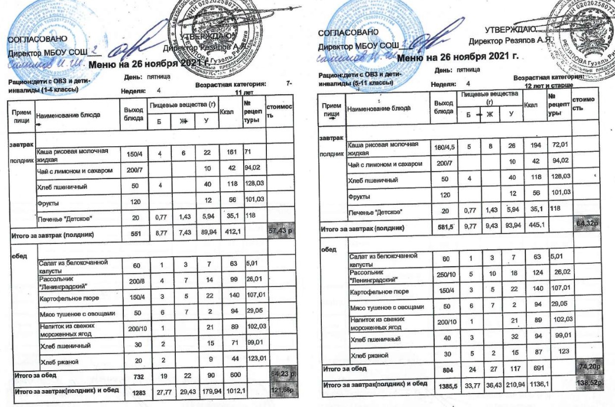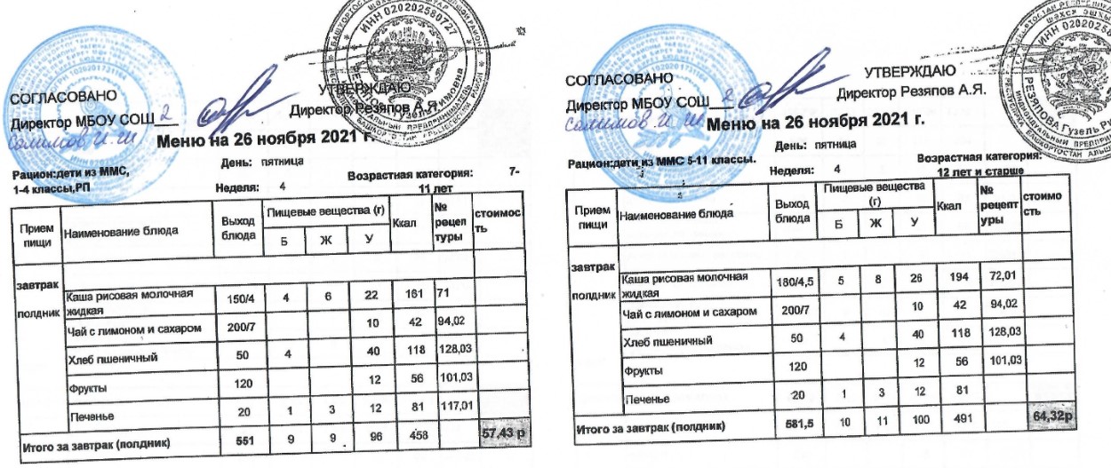 (Меню для детей из ММС, 1-11 классы, РП на 26 ноября 2021 года)