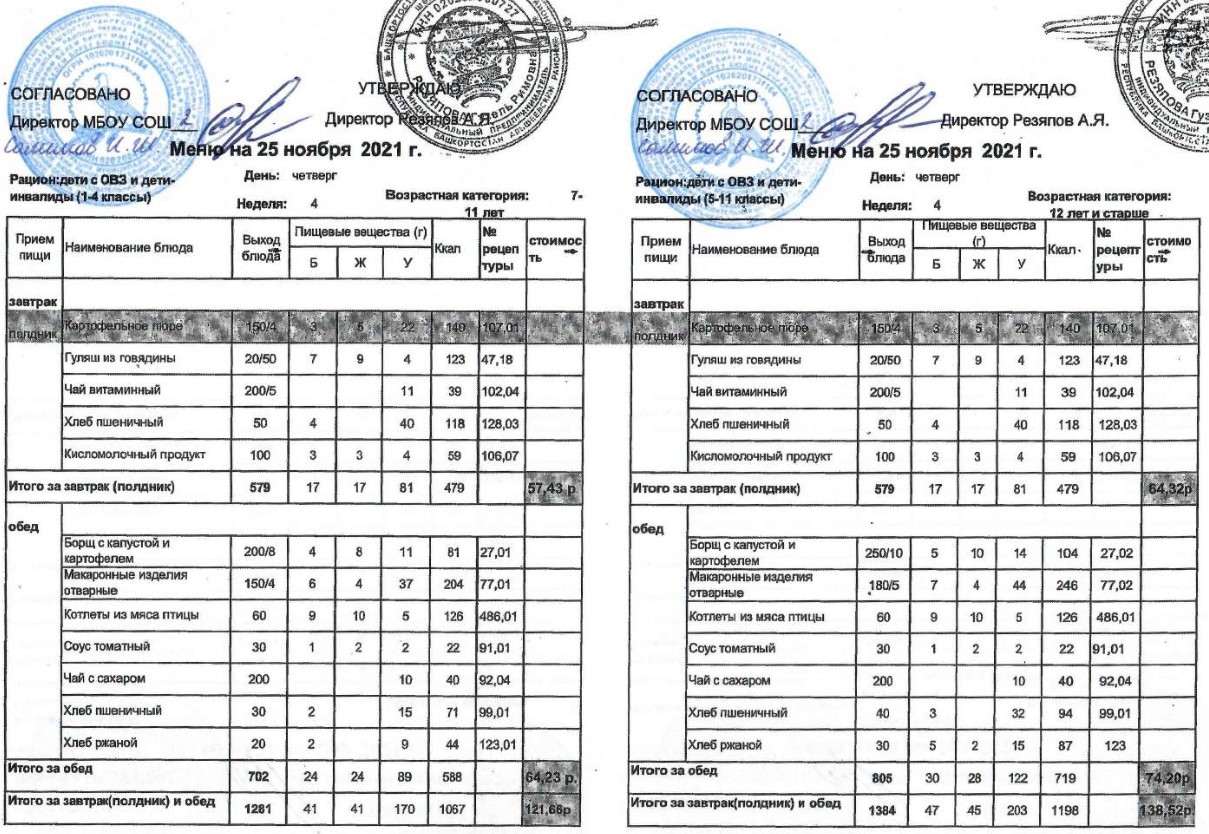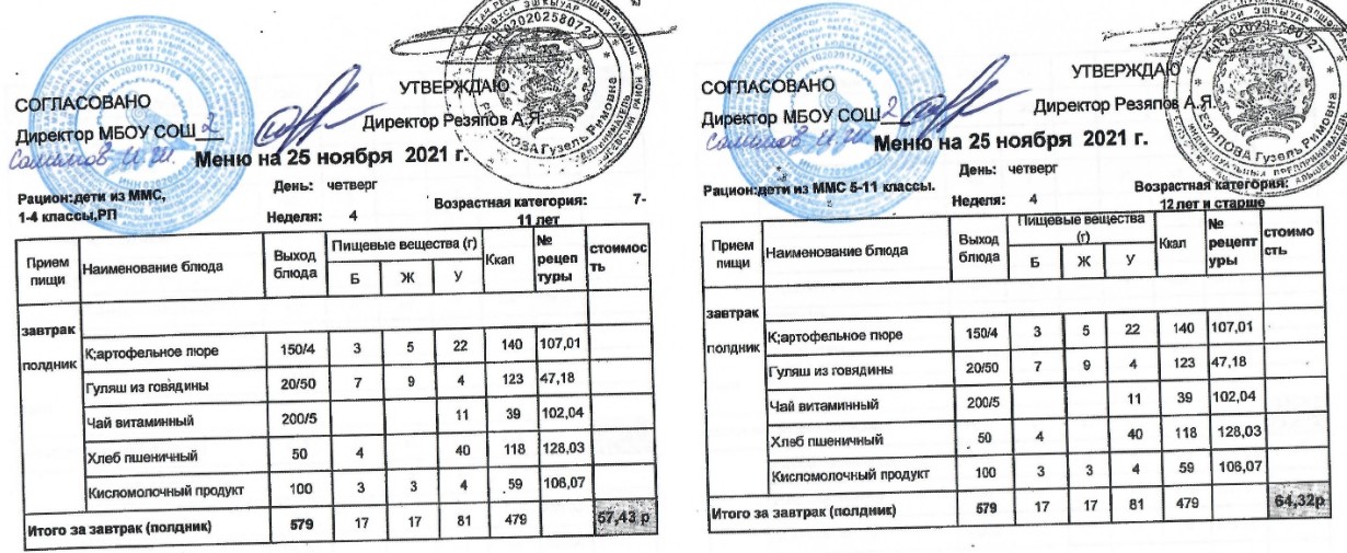 (Меню для детей из ММС, 1-11 классы, РП на 25 ноября 2021 года)