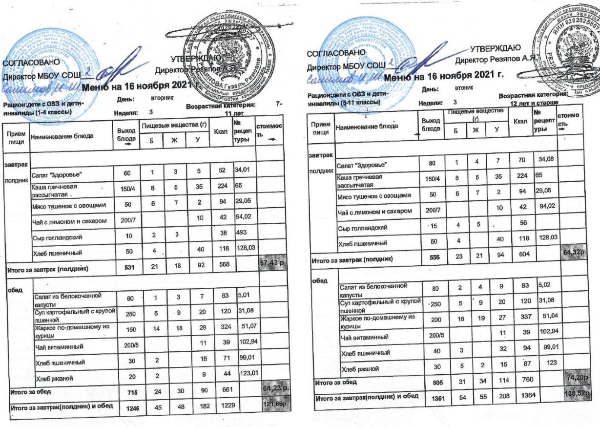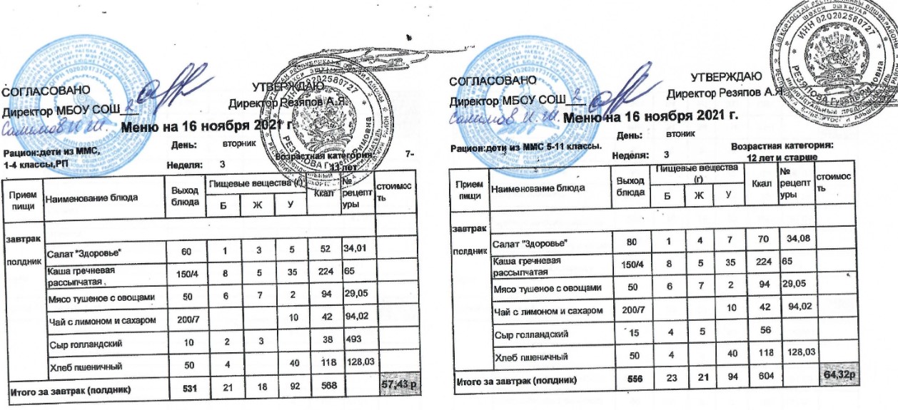 (Меню для детей из ММС, 1-11 классы, РП на 16 ноября 2021 года)