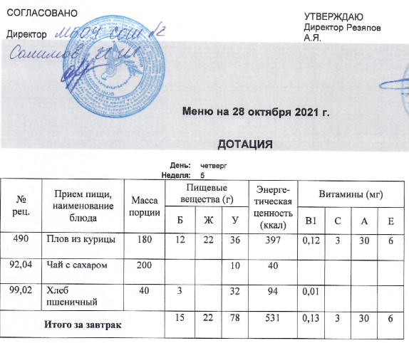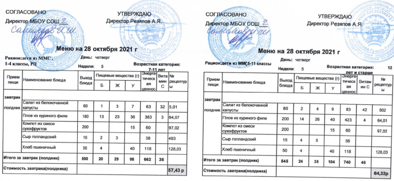 (Меню для детей из ММС, 1-11 классы, РП на 28 октября 2021 года)