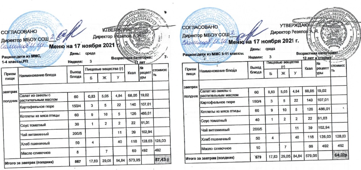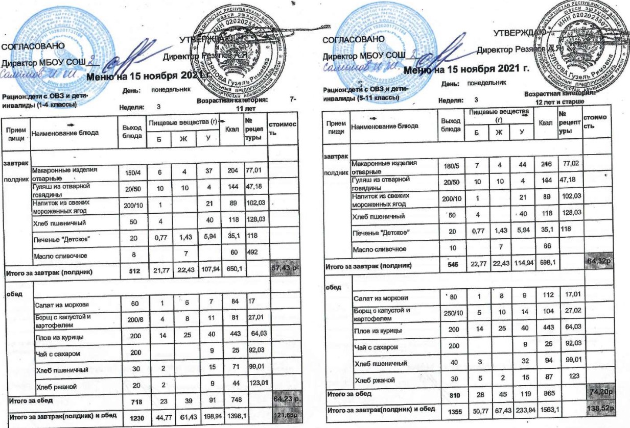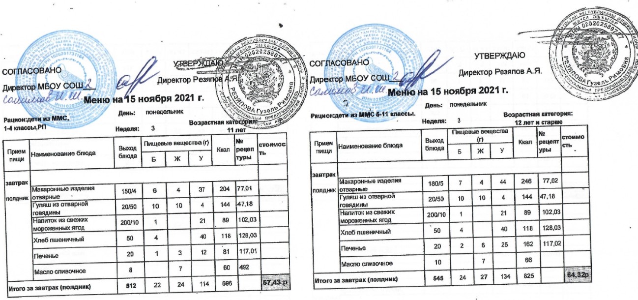 (Меню для детей из ММС, 1-11 классы, РП на 15 ноября 2021 года)