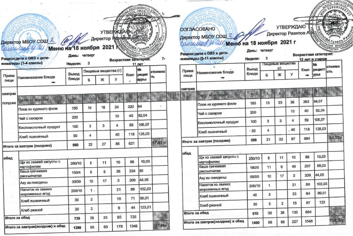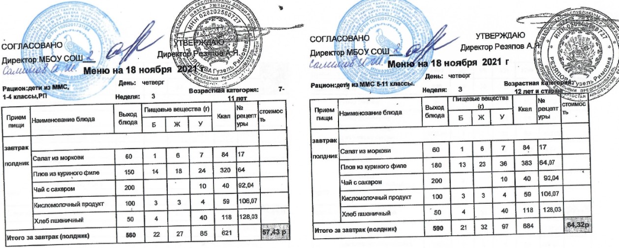 (Меню для детей из ММС, 1-11 классы, РП на 18 ноября 2021 года)