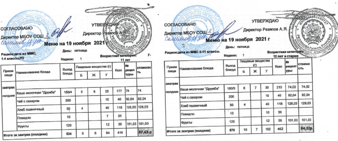 (Меню для детей из ММС, 1-11 классы, РП на 19 ноября 2021 года)