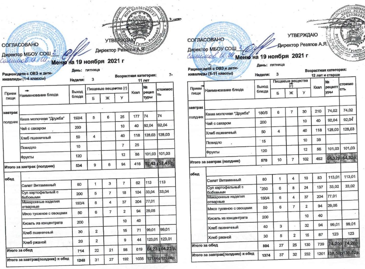 (Меню для детей с ОВЗ и детей-инвалидов, 1-11 классы на 19 ноября 2021 года)