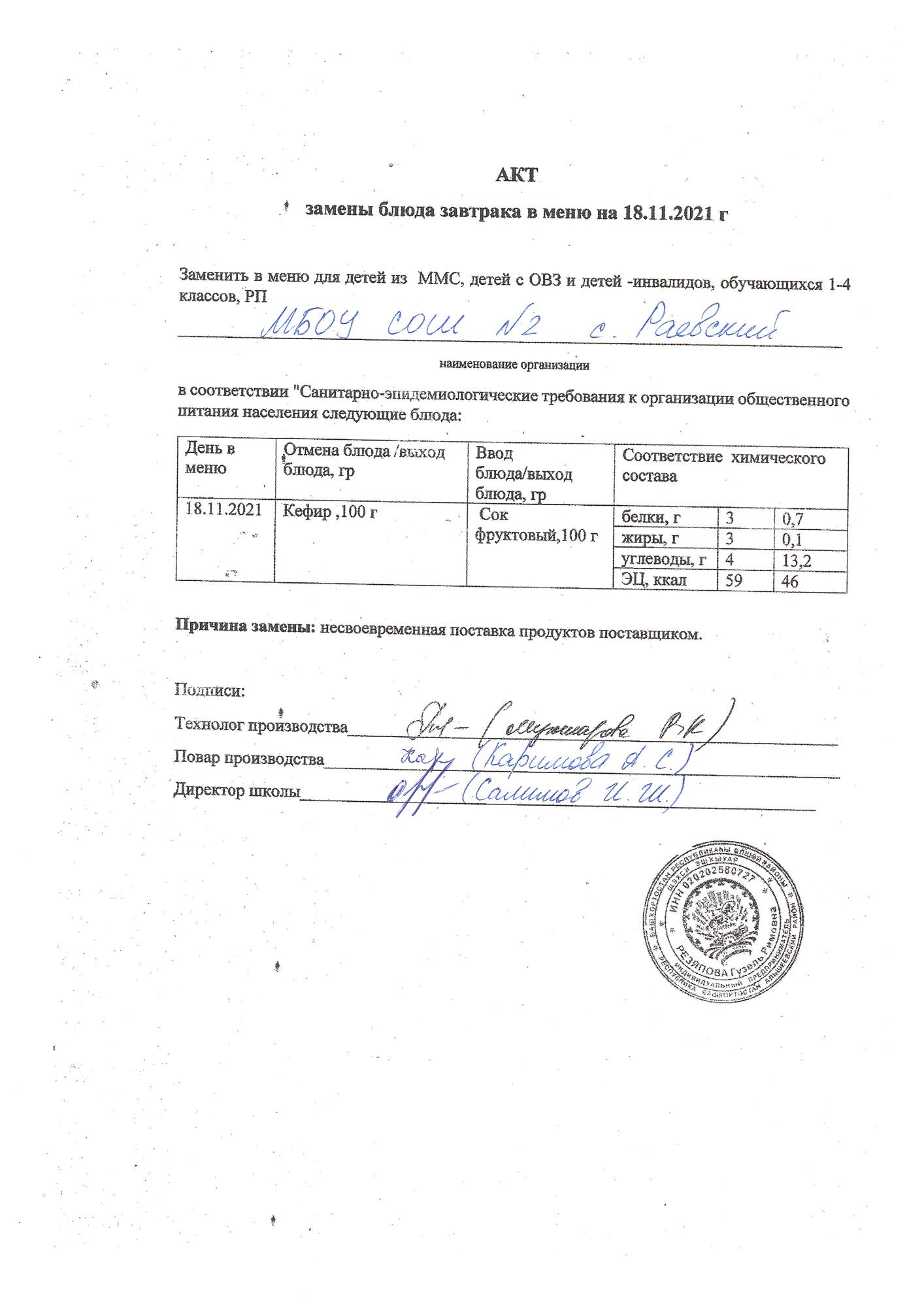 (Акт замены блюда завтрака в меню на 18.11.2021)