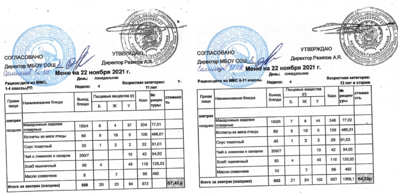(Меню для детей из ММС, 1-11 классы, РП на 22 ноября 2021 года)