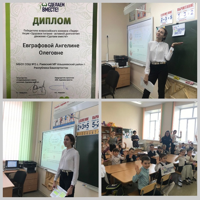 С февраля по март месяц 2019 года прошел Всероссийский конкурс "Лидер" Акции "Здоровое питание — активное долголетие" движения "Сделаем вместе". В этом конкурсе приняла активное участие ученица 11 класса нашей школы, стала победителем и выиграла путевку на 12-ю смену Международного детского центра "Артек"! Наши поздравления!!!